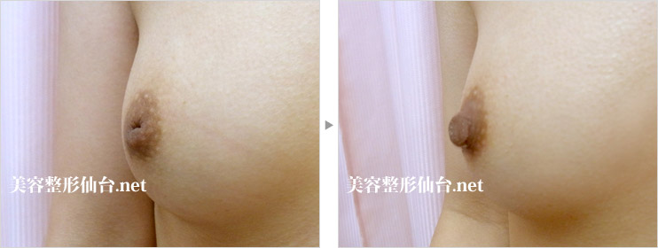 症例経過:乳頭を刺激しても乳頭が突出されない陥没乳頭の症例です。将来の授乳のことと、美容的面を考慮して陥没乳頭の治療を希望されました。平常時にも乳頭が突出するようになり、美容面、将来の授乳の面でも心配なくなりました。